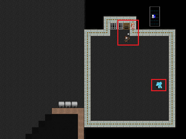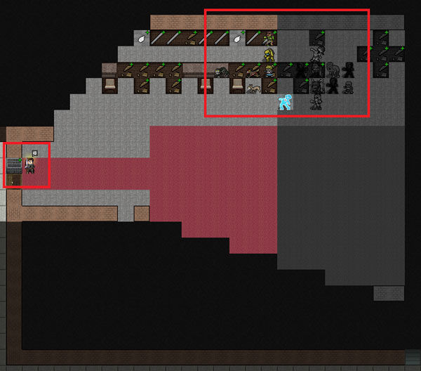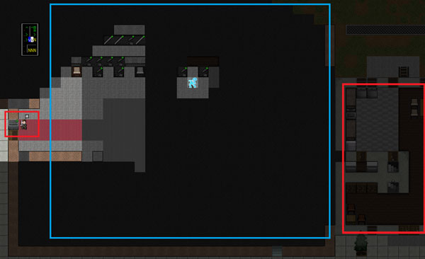複合施設の西側(青い四角)に到着しました。先ほど歩き回ったのは右にある赤い四角の区画になる。真っ暗な部屋の中に放電ゾンビが見えます。