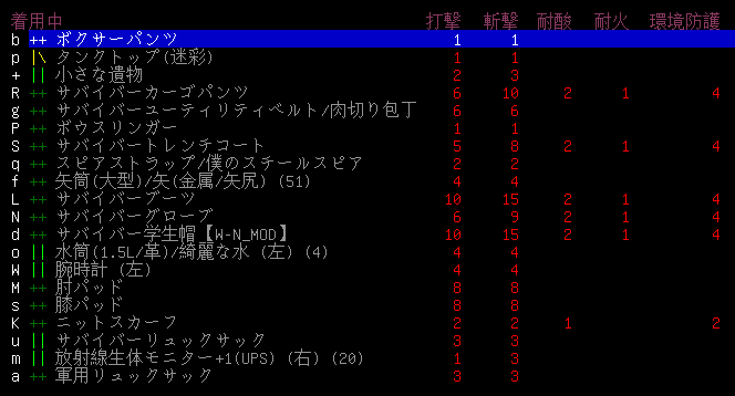 防具の損傷具合を確認しよう。装備していた防具は上の画像になっていた。タンクトップはボロボロだが他は無事だな。煙幕ゾンビとの戦闘がキツかったです。