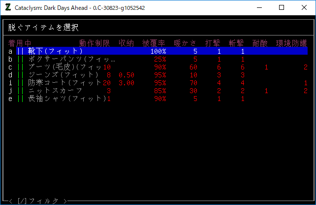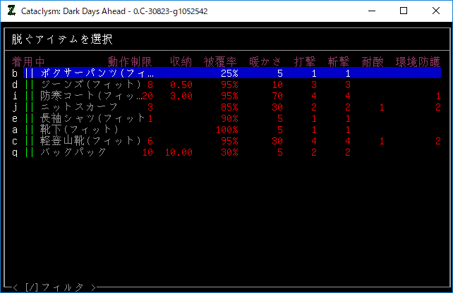 装備を外さないと拾えないのかと思い『T』アイテムを脱ぐを実行。脱ぐアイテムが表示をされました。衣服の性能が書かれているね。ACは無いのか。