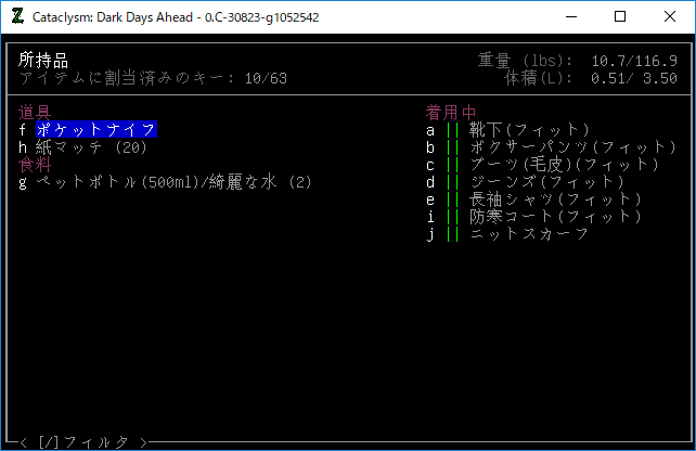 wikiの『初心者ガイド』→『初日を生き延びるために』を参考にして色々と試してみよう。『i』を押して持ち物を確認します。wikiに書かれているとおりポケットナイフ、紙マッチ、綺麗な水がありました。