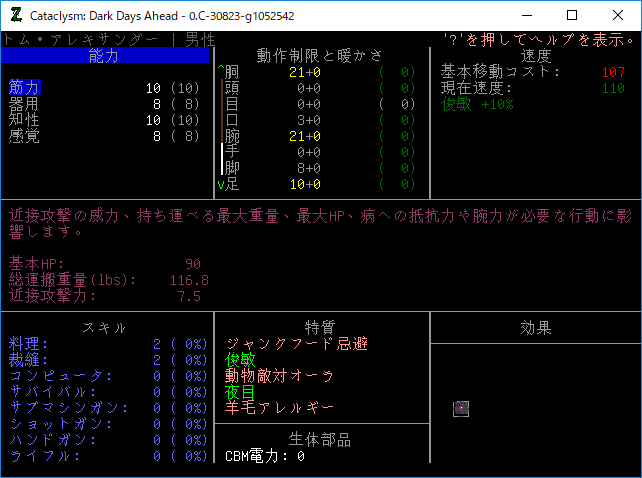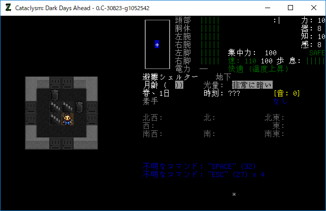 Cataclysmのプレイ日記を始めます。起動画面で『a読込』を選ぶとセーブを読み込めるのかな?まだこの程度のことも分かりません。