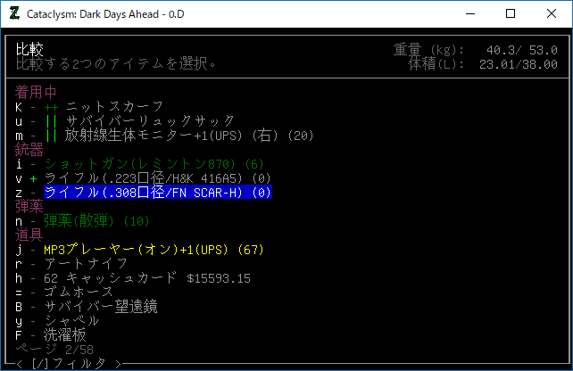 今回はここで中断します。ちょっと内容が薄いのでCataclysm:DDAの記事としては微妙だな。たまには便利なコマンドの勉強をしましょう。『I』コマンドを押すと2つのアイテムを比較することができます。『I』コマンドを押したら上の画像のようなメニューが表示される。ここで2つのライフルを選択すれば性能を比較できるってわけ。