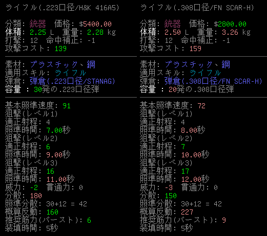 馬鹿でかい画像の重要な部分を切り抜いてみました。2つのライフルを比較して優秀な方が緑色で表示されています。この機能は便利なので今後の投稿で活用させてもらおう。