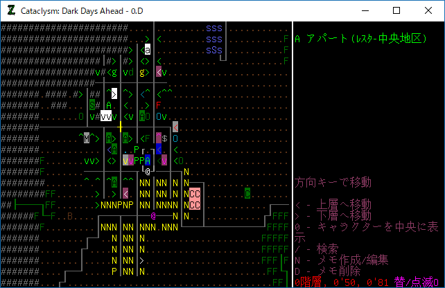 Cataclysmのプレイ日記を始めます。アパートを物色していたら夜になっちまったよ。微妙に時間が残っているから山小屋に帰るのはもったいない。今回はもうちょい町を探索します。