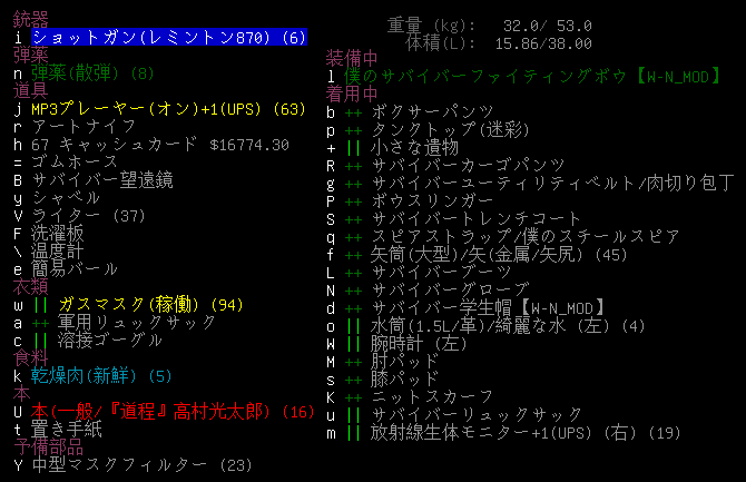 現在の所持品と装備品は上の画像。特にコメントは無いですな。次回は放置していた超人系ゾンビを皆○しにします。