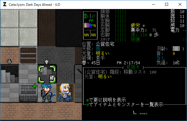 Cataclysmのプレイ日記を始めます。今日の探索で一気に公営住宅を制圧しよう。疲労が『**』になったら公営住宅で睡眠を取ります。