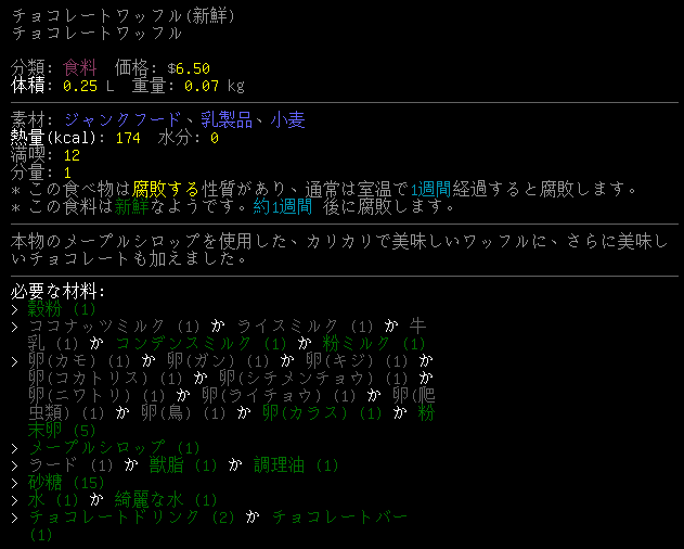 あれえ?調理したばかりのチョコレートワッフルが腐っているぞ。材料にしたカラスの卵が腐敗していたのかな。安定版0.Dの場合、料理の素材に腐敗したアイテムも選ばれるようです。