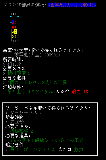 蓄電池とソーラーパネルは約18分で取り外しが可能だ。バージョンや能力値によって変化するかもしれません。あんがい短時間で取り外せるようだ。バッテリーが減ってきたら蓄電池を現地調達するのもアリだな。