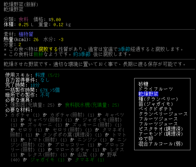 そういえば小型冷凍庫をオフにしたせいで野菜や果物に『(柔)』フラグが付いたのだった。再度、凍結させたのだがクラフトの材料として使えるのかな。