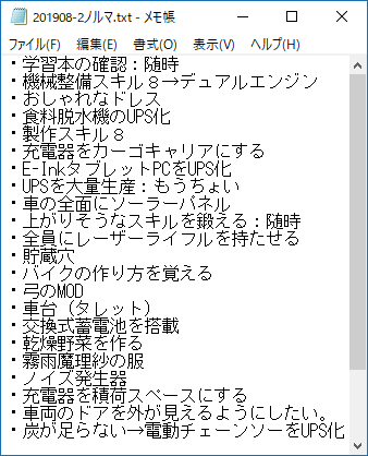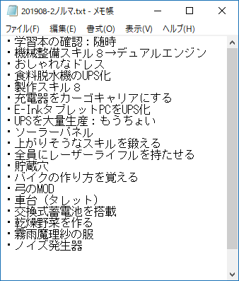 ここ数日間の探索中にやりたい作業をメモしていました(上の画像)。はやく霧雨魔理沙の服をクラフトしたいなあ。救急車を電気自動車化する作業も楽しそうだ。
