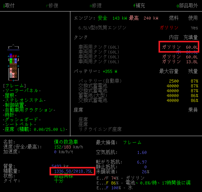 救急車の性能は上の画像。1336.0Lもの荷物を積んでいるなんて欲張りすぎだろう。現在はタンクの中に133.8Lのガソリンが入っています。西地区の平野から山小屋に戻った後に8気筒エンジンの燃費の悪さを再確認して絶望することになる。