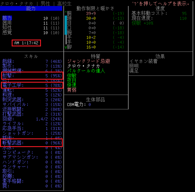 時刻はAM1:17になった。早く寝ないと明日に響きます。あと少し作業をさせてください。射撃、電子工学、斬撃がスキルアップ手前なのだ。俺は記憶力が悪いから忘れないうちにこれら3つのスキルを上げておきたい。
