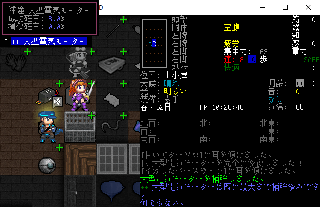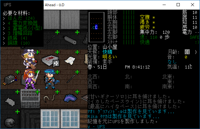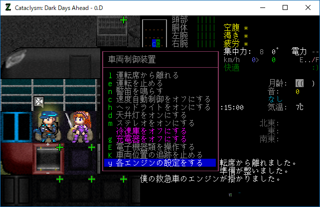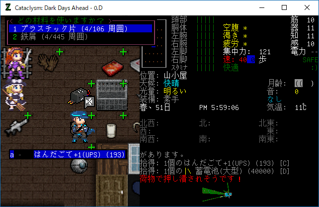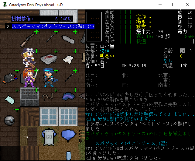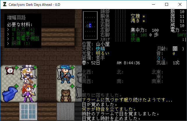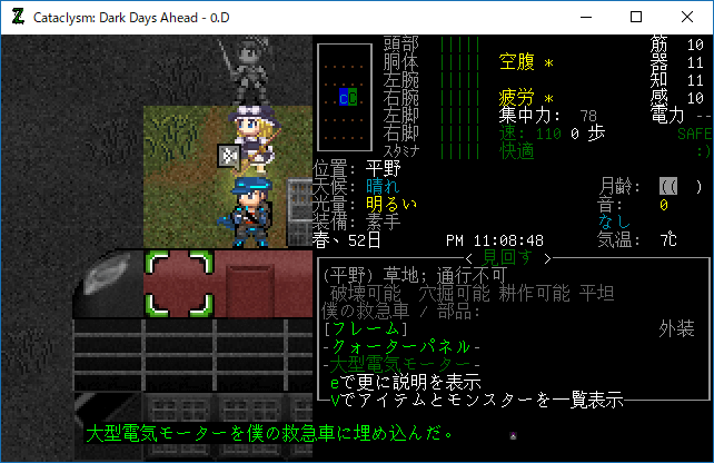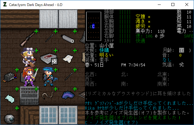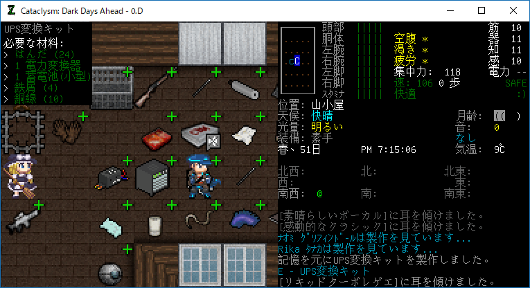 Cataclysmのプレイ日記を始めます。僕のおうちに霧雨魔理沙が来てくれました。今回も山小屋で作業をしたいと思います。そろそろ救急車をハイブリッドカーに改造しようかな。