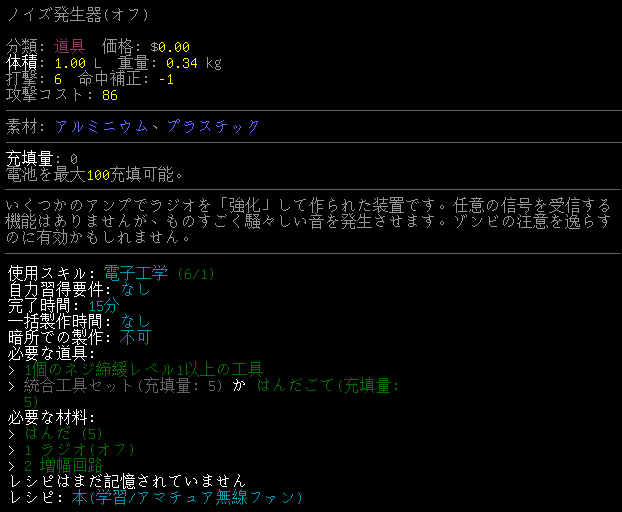 次は『ノイズ発生器』を製作しましょう。こいつは大音響を鳴らすアイテムと書かれていますね。使用するとゾンビが近づいてくる迷惑な電子機器です。