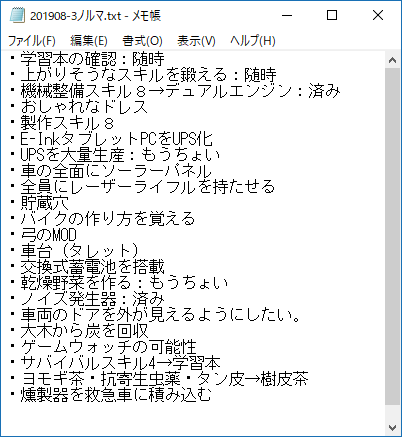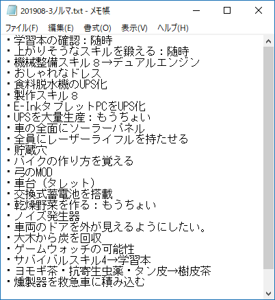 朝食の後はひたすら機械整備スキルの学習本を読みます。深夜まで掛かって機械整備スキルを8に上げました。スキル上げだけで丸一日が終わってしまったよ。ハイブリッドカー化には計り知れない価値があるから構わないけどさ。