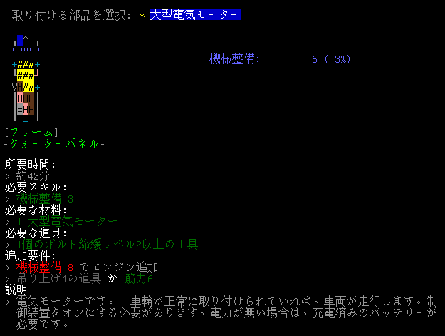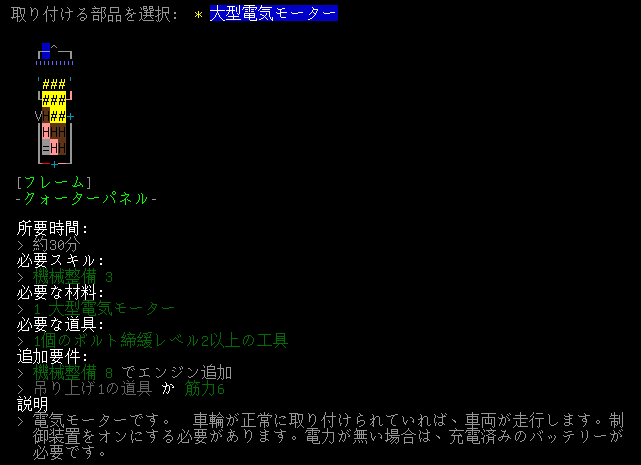 大型電気モーターの設置に必要なのは締緩レベル2の工具だ。画像を見たところ吊り上げ工具もいらないみたい。条件としてハードルが高いのは機械整備スキル8かな。電気モーターのみを設置するなら8まで上げなくても大丈夫です。