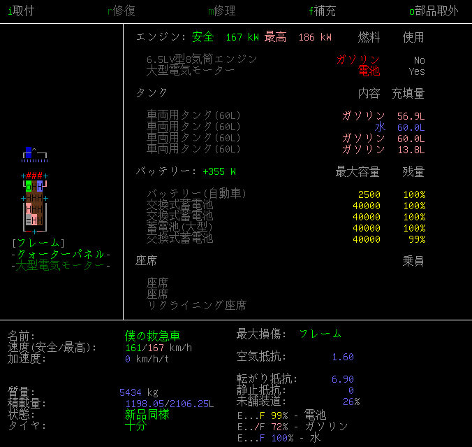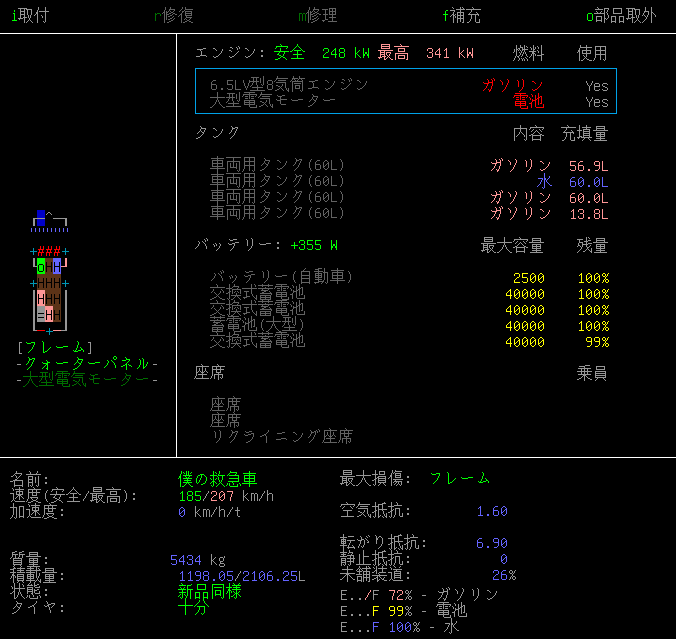 救急車の性能は上の画像。現在は6.5LV型8気筒エンジンと大型電気モーターが両方ともオンになっているね。2つのエンジンを稼働させるのは燃料の無駄なので8気筒エンジンの方をオフにしたい。