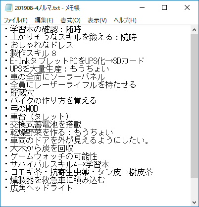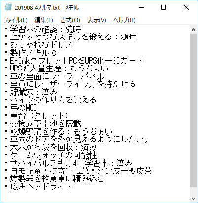 やるべき事が沢山ありすぎて頭がおかしくなりそうだよ。本当に必要な物をコツコツと作っていこうか。そういや自動車のトランクに荷物を積んだままでした。全てのアイテムを拠点に移動させるだけで5~6時間くらいかかるな。