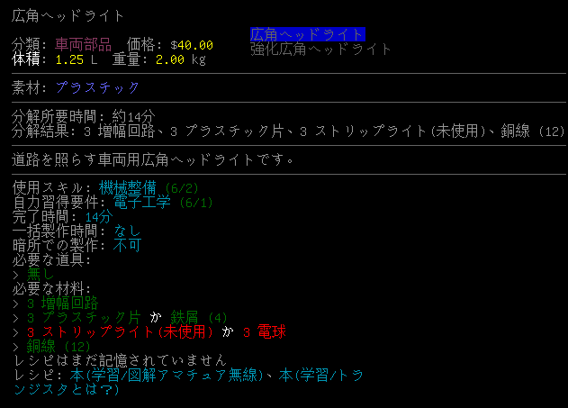 タロウ・タナカの機械整備スキルが8に上がりました。クラフト画面を観察して便利なアイテムがあれば製作しようぜ。『広角ヘッドライト』は是非とも欲しいですな。救急車は幅が広いから普通のヘッドライトだと物足りないのだ。材料の『ストリップライト』は監視ロボットを分解すれば手に入ります。