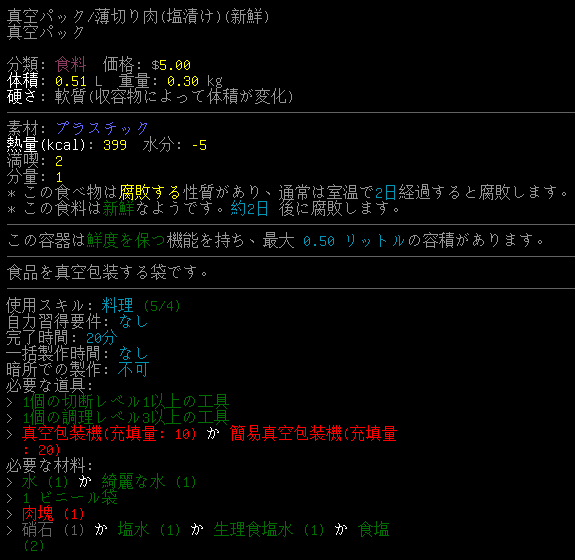 真空包装機を使ってパックする際には塩が必要みたいね(上の図)。塩は貴重品だし回収できる湿地帯が見つかっていません。お野菜を新鮮なままパックしたかったけど無理だ。