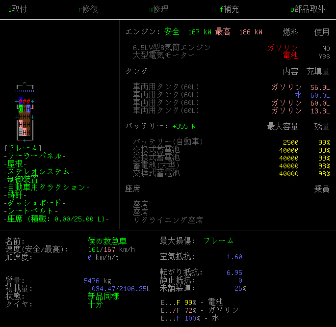 救急車の性能は上の画像。大型電気モーターを搭載して初めての運転になります。もうガソリンの消費は気にしなくても良いのでスピードを出しまくろうぜ。