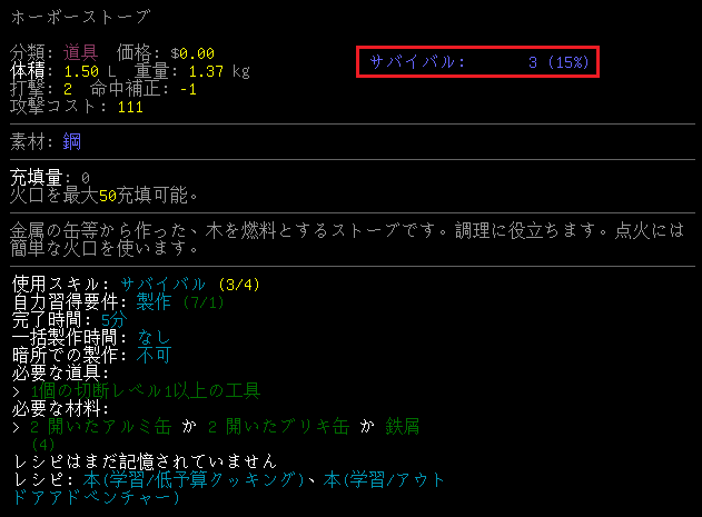 学習本が無いならクラフトでスキル上げをするしかありません。サバイバルスキルを上げるのにちょうど良い製作物を探していたら発見した!『ホーボーストーブ』は難易度4、完了時間5分、そして材料が4個の鉄屑だけと素晴らしい。