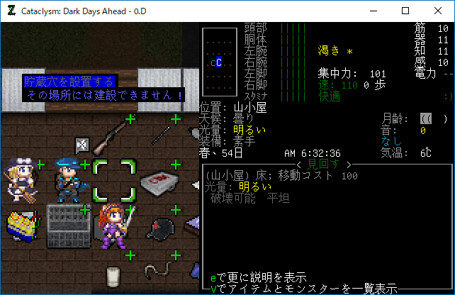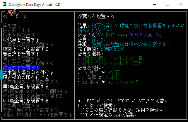 Cataclysmのプレイ日記を始めます。前回は救急車をハイブリッドカーに改造しました。今回は食料を溜め込む『貯蔵穴』の建造に挑戦します。
