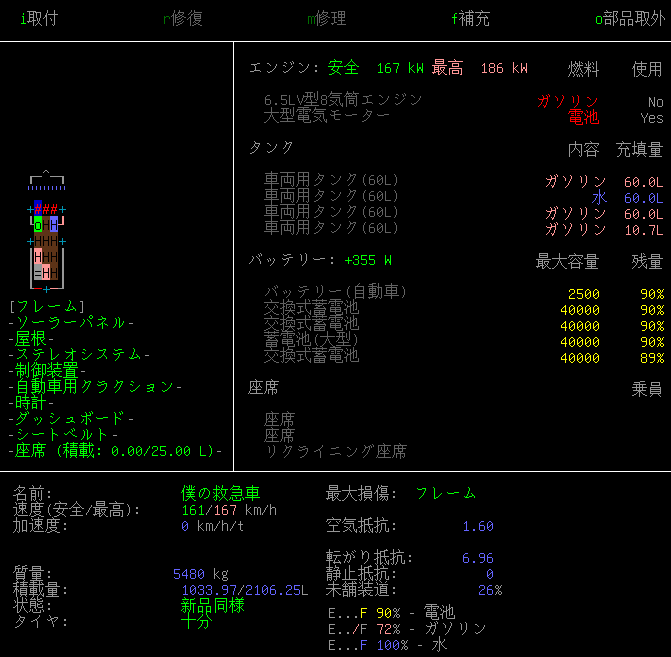 救急車の性能は上の画像。最強号と比べたら電力の消費が早い。さらに言えばバッテリーの回復が遅い。最強号は大型蓄電池を8個ほど搭載していたしソーラーパネルを貼りまくっていたから当たり前か。