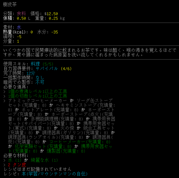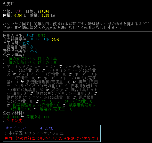 ここで僕ちゃんがおかしな勘違いをします。タン皮を材料にした樹皮茶は料理スキルが5あれば製作可能です。なぜかサバイバルスキルが6必要だと勘違いをした。サバイバルスキル6は『自力習得要件』だ。