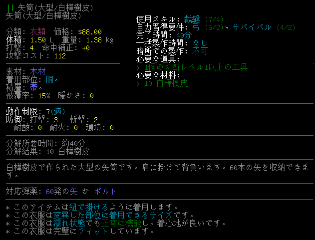 白樺樹皮で矢筒を作ろうかと思ったがやめた。白樺の矢筒は動作制限が7と高い。いつも身に付けている革製の矢筒の方が動作制限3と低くて優秀なのだ。