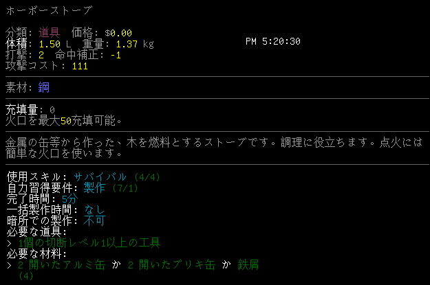 ホーボーストーブを製作してサバイバルスキルが4から5に上がりました。プレイ当時はスキルを上げないと寄生虫に殺されると焦っていたのです。まあこんな勘違いもたまにはあるさ。