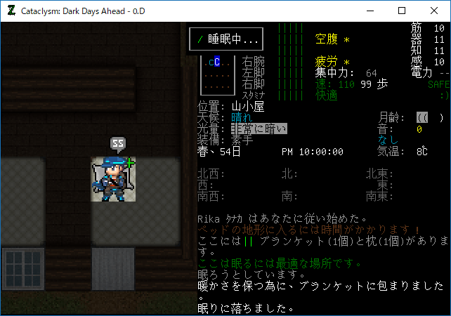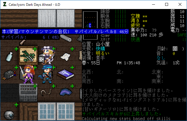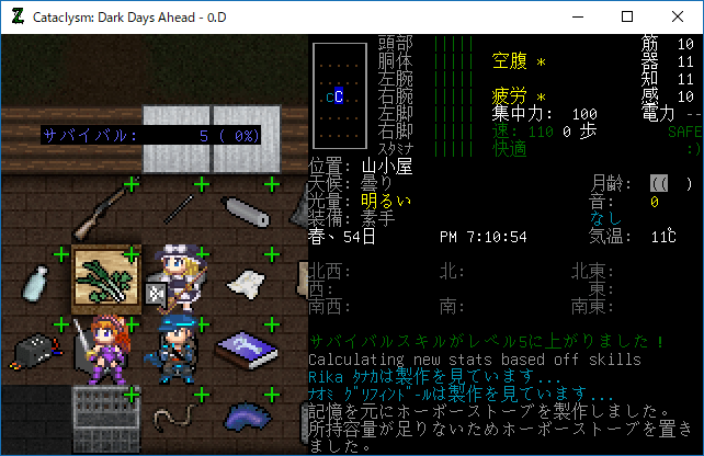 Cataclysmのプレイ日記を始めます。前回は拠点に貯蔵穴を設置しました。もう山小屋での作業は中断して町に出かけたい。しかしながら、ある事情により出発を延期することになった。