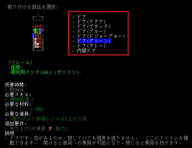 不透明ドアの代わりに取り付けるドアは普通のドアで良いだろう(上の図)。『車両のカラーバリエーション追加mod』のおかげで色が選べるようです。何色も組み合わせてカラフルな自動車にしようぜ。