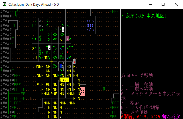 Cataclysmのプレイ日記を始めます。もう山小屋での作業を終わらせて町に行こう。今回は公営住宅の周囲にある施設を制圧します。余裕があればレスター西地区まで遠征したいと考えている。