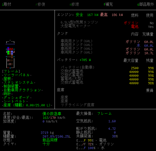 救急車の性能は上の画像。ソーラーパネルを貼りまくったのでバッテリーが満タンだ!今度こそバイクラックのレシピ本を拾ってみせるぞ。やる気がみなぎってきたあ!