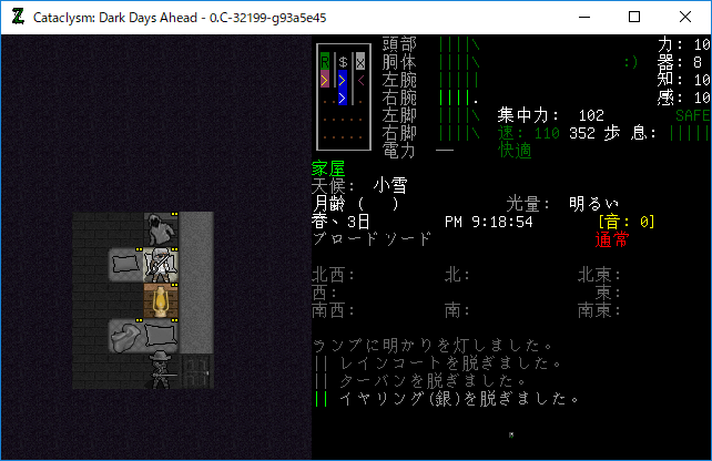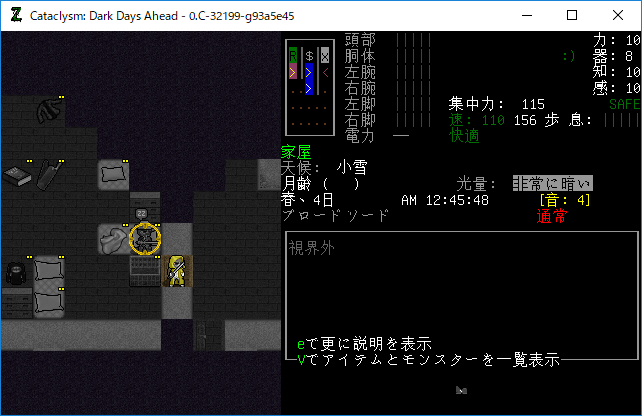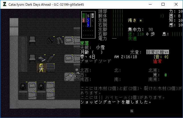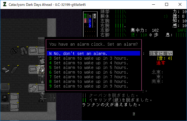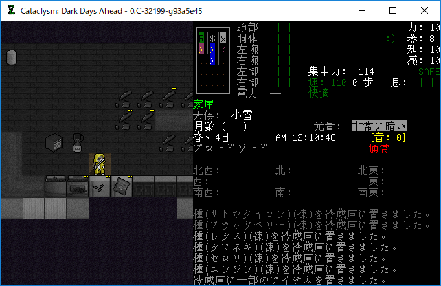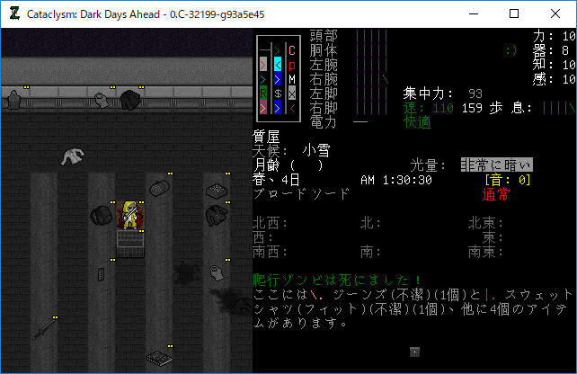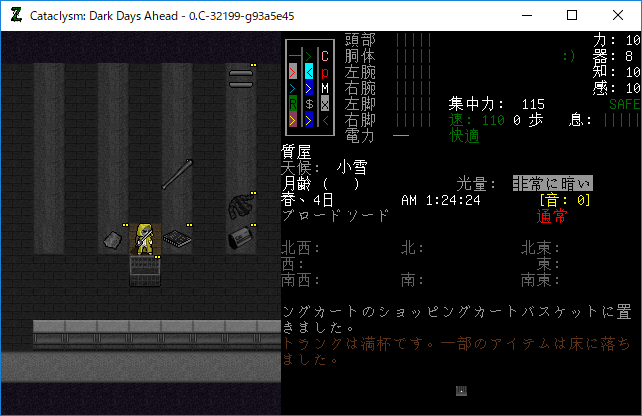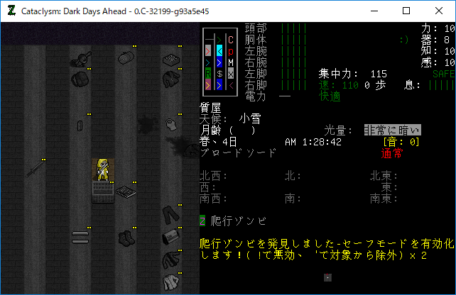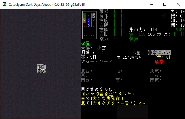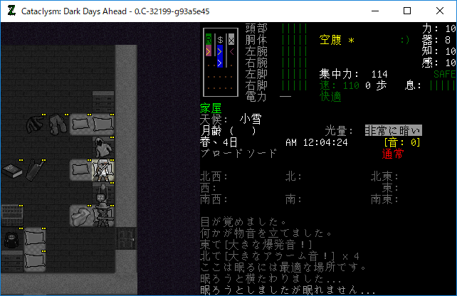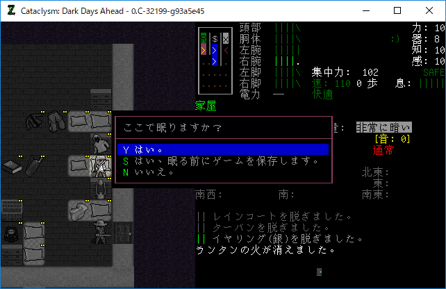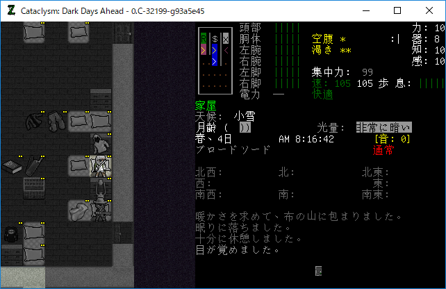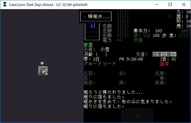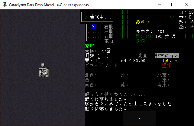 Cataclysmのプレイ日記を始めます。アイテムの回収に熱中していたら夜が更けてしまった。早く寝ないと明日に響きます。セバスチャンと一緒に寝ましょう。