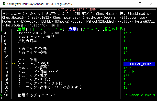 gfxフォルダにMSX++DeadPeopleEditionフォルダをコピーしました(最新のバージョンだと同梱されている?)。オプションで設定をするとタイルの変更に成功。私とセバスチャンの体が別々のタイルになっています。以前のタイルは裸になったら同じ外見だった。