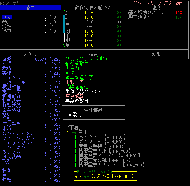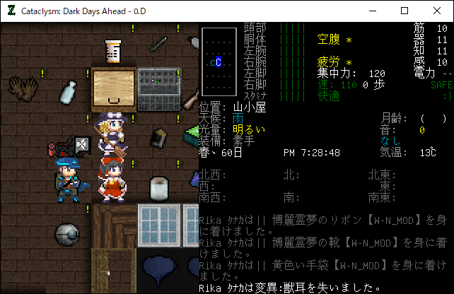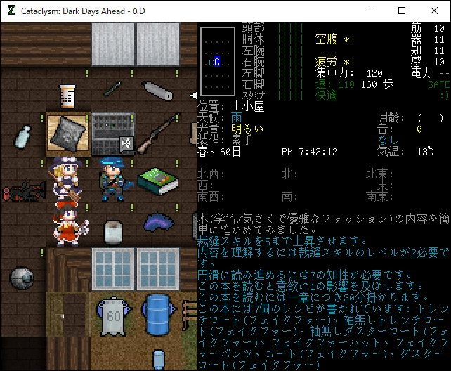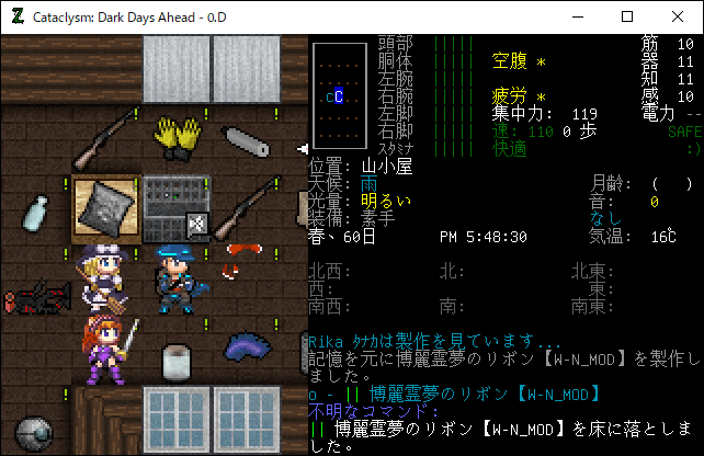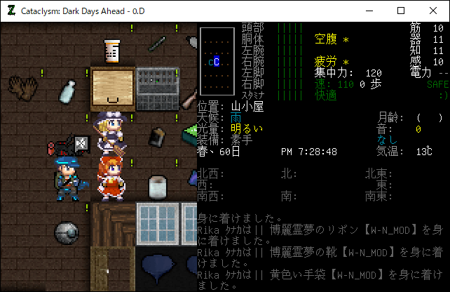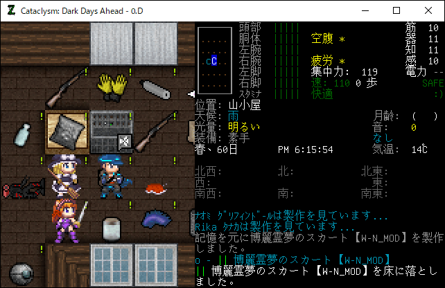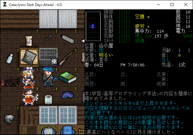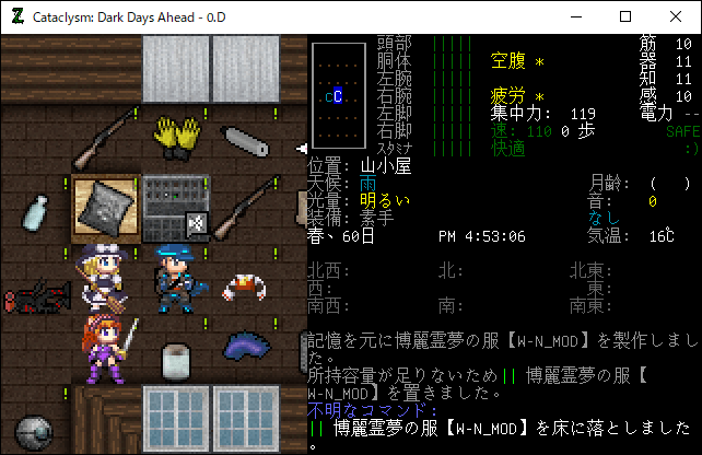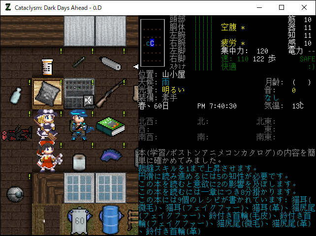 Cataclysmのプレイ日記を始めます。レスターの探索を中断して山小屋に戻ってきました。前回は起床した後に学習本を読んで中断したんだよね。今回は博麗霊夢のコスプレをして遊びます。