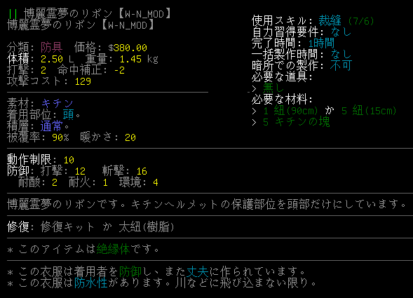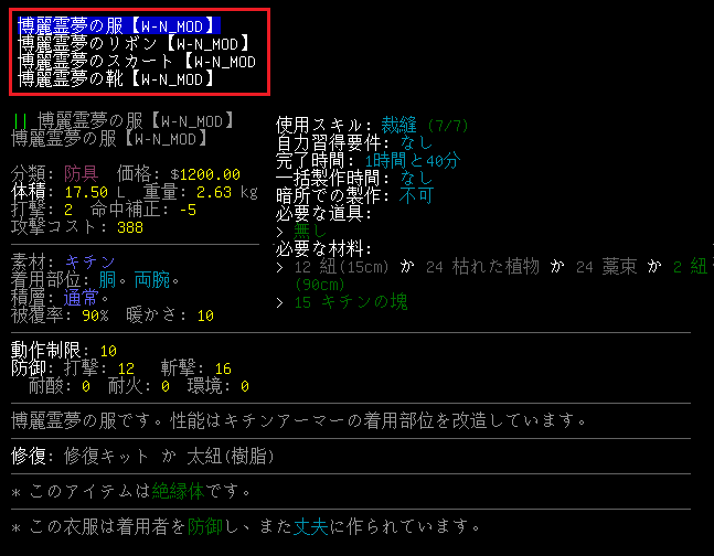 次は博麗霊夢のスカートをクラフトします。性能は魔理沙のスカートと同じになる。元々は『アームガード(キチン)』のjsonをコピペした物です。事情により保護部位は『脚』になります(笑)。