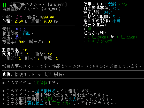 博麗霊夢のスカートを製作しました。ちなみに『+』コマンドで着用品の並び替えができます。上着をスカートの中に入れるか、スカートの外に出すかで見た目が大きく変わるのだ。