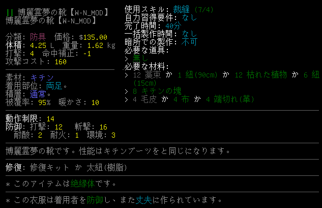 次は博麗霊夢の靴を作ります。性能はキチンブーツと全く同じですね。キチン製の防具って優秀だよなあ。耐酸はそんなに期待できないけど雑魚ゾンビの攻撃程度では破損しないからね。