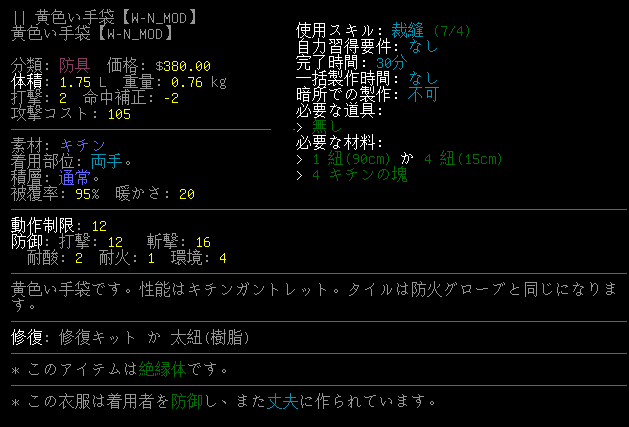博麗霊夢は素手のキャラクターだが『手』の部位を保護しないと危険です。東方のネタとは全く関係ないけど『黄色い手袋』を用意したよ。性能はキチンガントレット、タイルは防火グローブの手袋です。