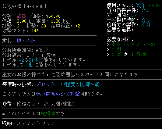 とりあえずこの髪色のまま投稿を進めます。博麗霊夢の専用武器として用意した『お祓い棒』をクラフトしよう。性能は簡易ハルバードと同じになります。いまだに簡易ハルバードが最強の斬撃武器なのだ。
