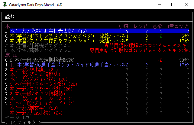 回収してきた全ての学習本を確認しました。学習本の内容は上の画像。コンピュータースキルのレア本をゲットできたから喜ぶべきだろうな。あんがい家屋ばかり漁っていてもレアな学習本を拾えるものだ。