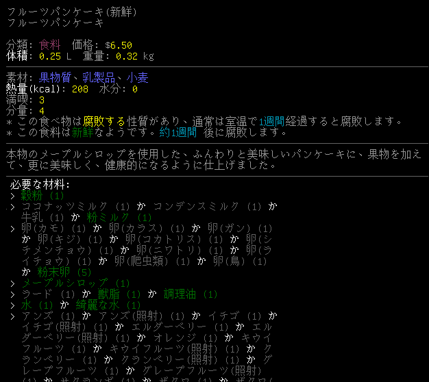 やたらと材料が豪華な『フルーツパンケーキ』を製作することにした。崩壊後の世界においては新鮮な卵やフルーツを確保するのが難しい。満喫が『3』と低いけどフルーツパンケーキはなかなか食べられないんだぜ。