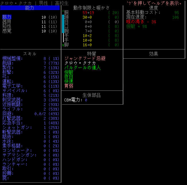 現在の能力値は上の画像。次回はサバイバーハーネスの製作を行います。サバイバーハーネスはレーザースナイパーを収納するバッグです。着用部位は胴体だから動作制限が心配だな。