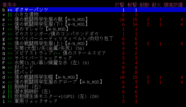 現在の防具は上の画像。サバイバーリュックサックは胴体部位に装着しているので破損しやすい。そのくせ修復に時間が掛かるから面倒くさいんだよ。