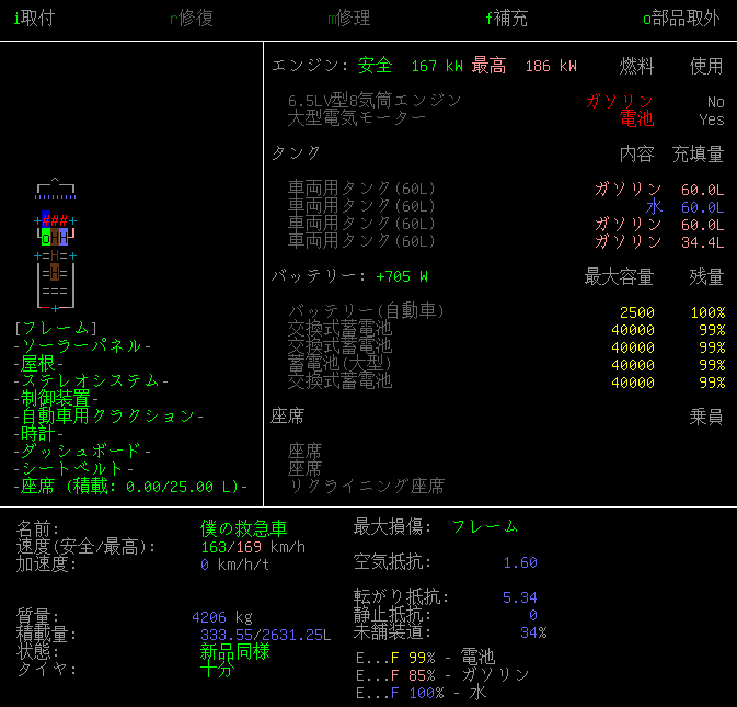 救急車の性能は上の画像。いつの間にかバッテリーが満タンになっていやがる。しばらくは普通のソーラーパネルだけでも電力は足りそうだ。