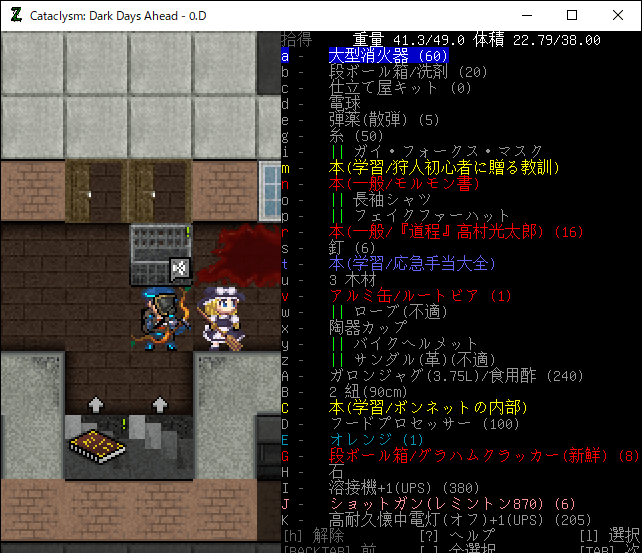 1軒目の家屋から回収したアイテムは上の画像。大型消火器は何かと便利なアイテムだ。CataclysmDDAの炎はとんでもない威力があるから大型消火器はいくつか集めておきたい。