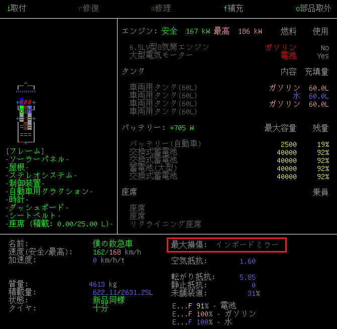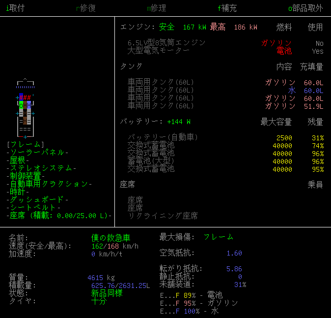救急車の性能は上の画像。まだまだ荷物は大量に搭載できるぜ。今回手に入れた積荷スペースを外付けすればレスタ-北地区にあるアイテムを根こそぎ持ち帰るのも可能でしょう。